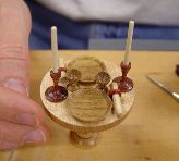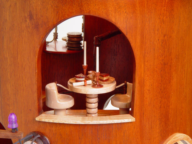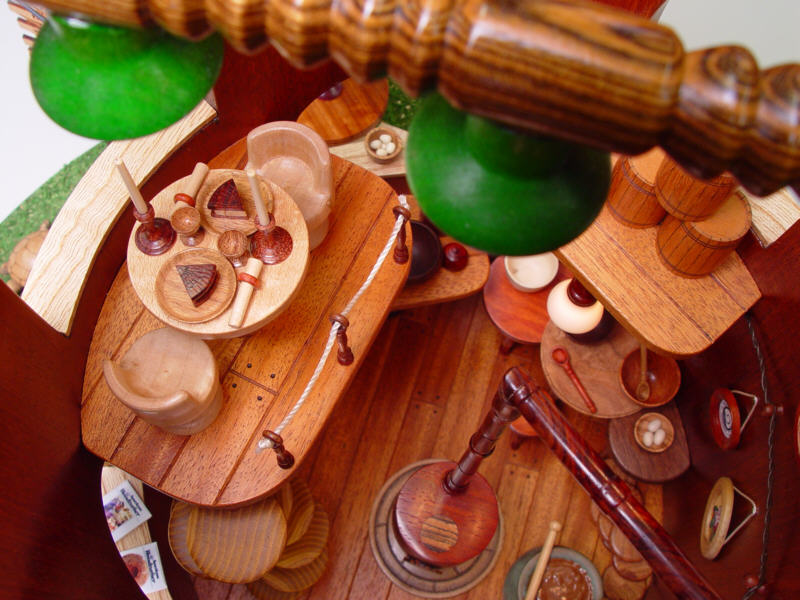 In the 'breakfast nook' on the second floor of the factory, Stan created everything on the dining table as well as the spindles holding up the rope railing.